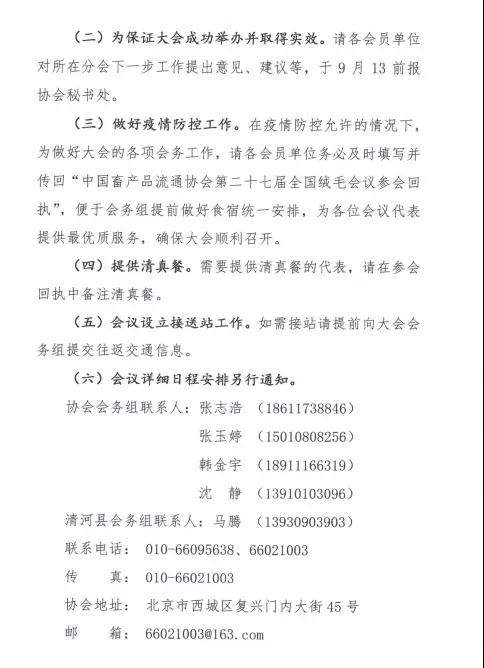 近日,中国畜产品流通协会印发通知,确定于2020年9月18日至20日在清河召开“第二十七届全国绒毛会议”。据悉,会议期间将同期举办“第五届中国绒毛产业发展峰会”暨“中国(清河)绒纺产业发展对接会”等相关活动,与会人员将参加第二十七届中国·清河国际羊绒及绒毛制品交易会。