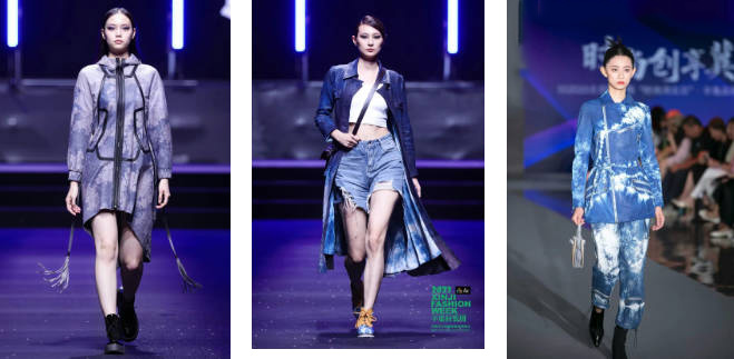 图休的服饰作品全部采用蓝靛、茜草、五倍子、槐米等中草药植物为染料,采用如扎染、雕版印花等多种形式的手工印染技法,进行多色彩的创意纹样设计。其“衣植染”技术实现了皮革从鞣制到染色的整个生产过程环保且无污染,品牌期望通过“衣植染”技术引发一场绿色皮革技术的革新,推动传统皮革制品的文化创新设计。图休本季作品“青花”的设计灵感来源于景德镇的青花瓷,旨在透过服饰将中国传统青花瓷的独特魅力与现代审美相结合,展现出品牌别具一格的美学体验。以青花瓷白底蓝花图案、温润如玉的质地和精致的工艺,结合图案的婉转曲线、优雅构图及色彩搭配,将传统与现代风格完美融合。