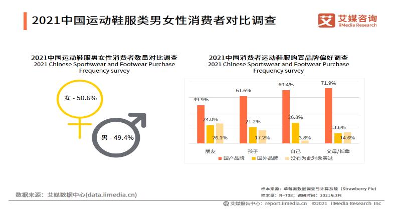 iiMedia Research(艾媒咨询)数据显示,中国运动鞋服市场的女性消费者比例略微高于男性,占比约50.6%。此外,在各个运动鞋服的消费场景中,国产品牌皆为消费者首选。艾媒咨询分析师认为,由于女性消费者经常充当着为家庭成员购置衣物的角色,导致其在该方面的支出和次数略微高于男性消费者。