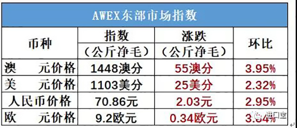 以澳元计价的EMI(东部市场价格指数)本周收于1448澳分/公斤(净重),环比上涨3.95%(上涨55澳分)。