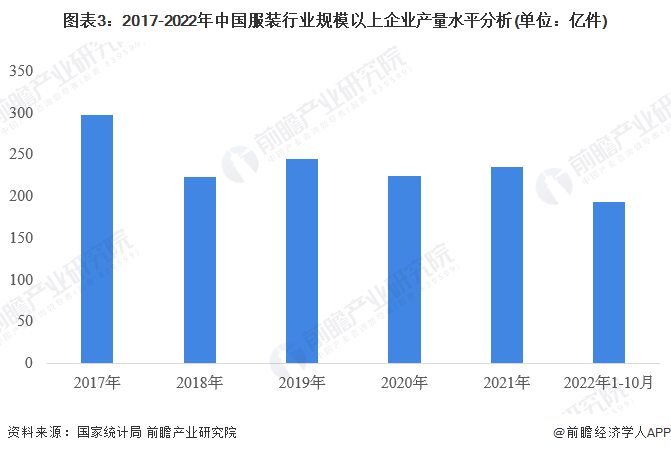 根据国家统计局数据显示,2017-2021年,我国服装行业规模以上企业产量总体呈波动下降态势。2021年,规模以上企业产量服装产量为235.4亿件。2022年1-10月,规模以上企业完成服装产量152.59亿件,同比下降1.42%。