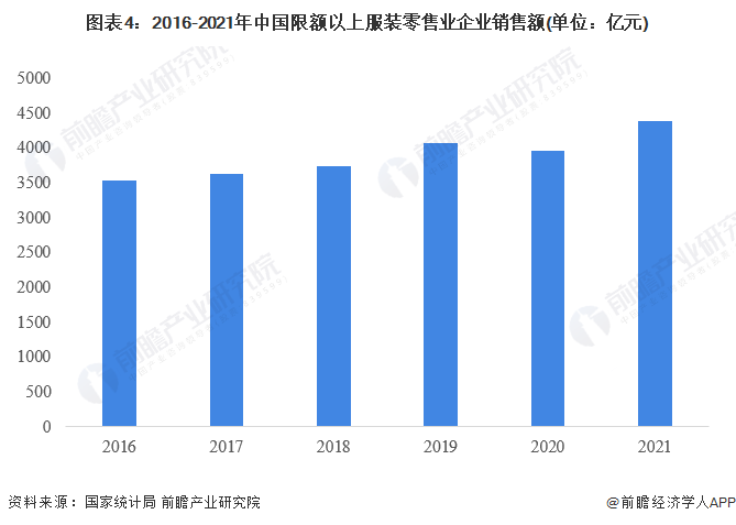 2016-2021年,我国限额以上服装零售业企业销售额总体平稳上升。2021年,我国限额以上服装零售业企业销售额4385.28亿元,同比增长10.65%。