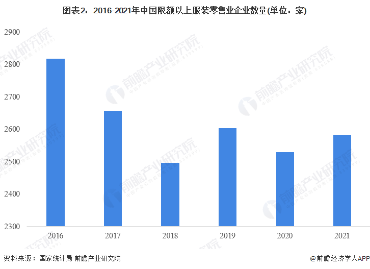 国家统计局数据显示,2016-2021年,限额以上服装零售业企业数量总体呈波动下降态势。2021年,限额以上服装零售业企业数量2583家,同比增长2.09%。