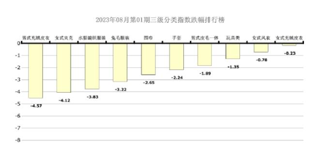 6大分类三级分类中男式充绒皮衣、女式夹克、水貂编织服装、兔毛服装、围巾、手套、男式皮毛一体、玩具类、女式风衣、女式充绒皮衣处于跌幅榜前十列,环比跌幅分别为:4.57点、4.12点、3.83点、3.22点、2.65点、2.24点、1.89点、1.35点、0.78点、0.23点。本期女式夹克、水貂编织服装、兔毛服装、围巾、男式皮毛一体、玩具类、女式风衣均呈现涨后回落态势。