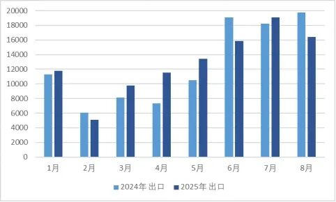 2025年1-8月各品类累计出口额变化情况(单位:万美元)
