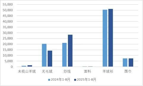 2025年1-8月,山羊绒原料及制品进出口总额为12.62亿美元,同比下降5.07%,整体延续“出口微增、进口下降”的态势,出口品类单价持续优化;进口受市场需求变化影响,整体规模进一步缩减。