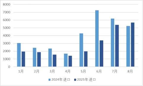 2025年1-8月各品类累计进口额变化情况(单位:万美元)
