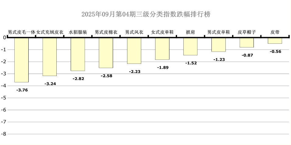 6大分类三级分类中男式皮毛一体、女式充绒皮衣、水貂服装、男式皮棉衣、男式风衣、女式皮单鞋、披肩、男式皮单鞋、皮草帽子、皮带处于跌幅榜前十列,环比跌幅分别为:3.76点、3.24点、2.82点、2.58点、2.23点、1.89点、1.52点、1.23点、0.87点、0.56点。本期男式皮毛一体、男式风衣、女式皮单鞋、男式皮单鞋均呈现涨后回落态势。