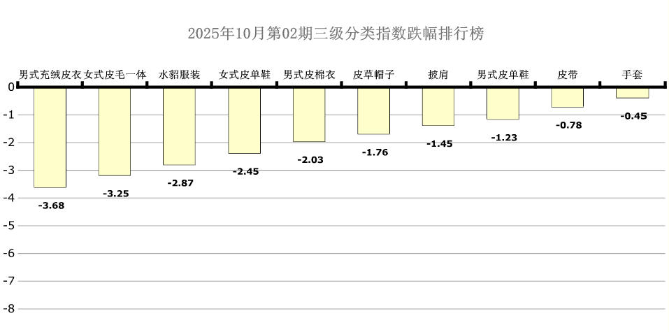 6大分类三级分类中男式充绒皮衣、女式皮毛一体、水貂服装、女式皮单鞋、男式皮棉衣、皮草帽子、披肩、男式皮单鞋、皮带、手套处于跌幅榜前十列,环比跌幅分别为:3.68点、3.25点、2.87点、2.45点、2.03点、1.76点、1.45点、1.23点、0.78点、0.45点。本期水貂服装、女式皮单鞋、男式皮棉衣、皮草帽子、披肩、男式皮单鞋、皮带、手套均呈现涨后回落态势。
