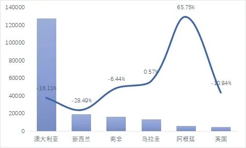 2025年1~9月中国进口主要产毛国羊毛数量与同比情况(单位:吨,%)