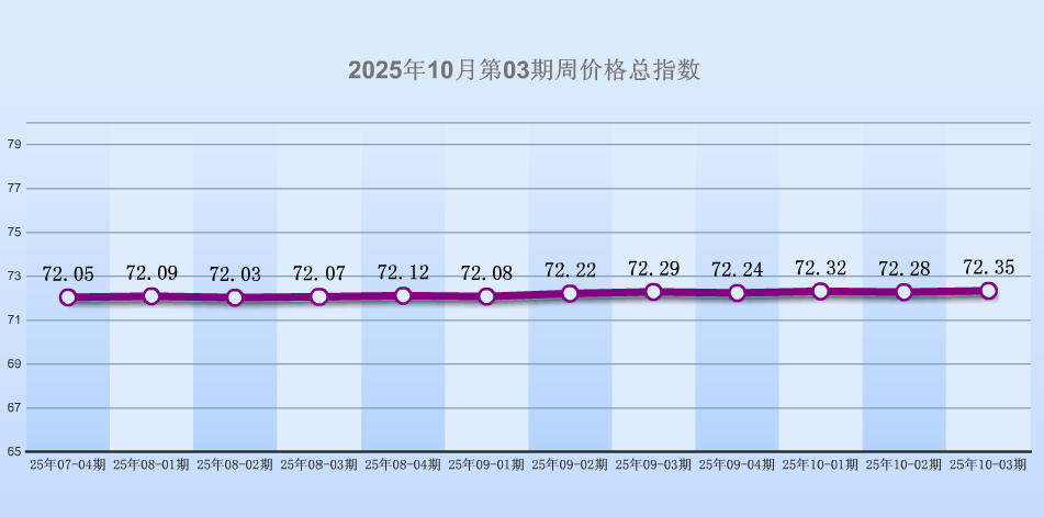 据“中国·海宁皮革指数”信息系统监测,2025年10月第03期周价格总指数报收于72.35点,环比上涨0.07点,环比涨幅0.10%,6大分类涨跌平比例是3:2:1。本周皮革城传统市场销势呈现微幅上涨,其中服装类、服饰类、原材料类价量不等量上涨,箱包皮具类、鞋类价量不等量下跌,其他类价量保持不变。