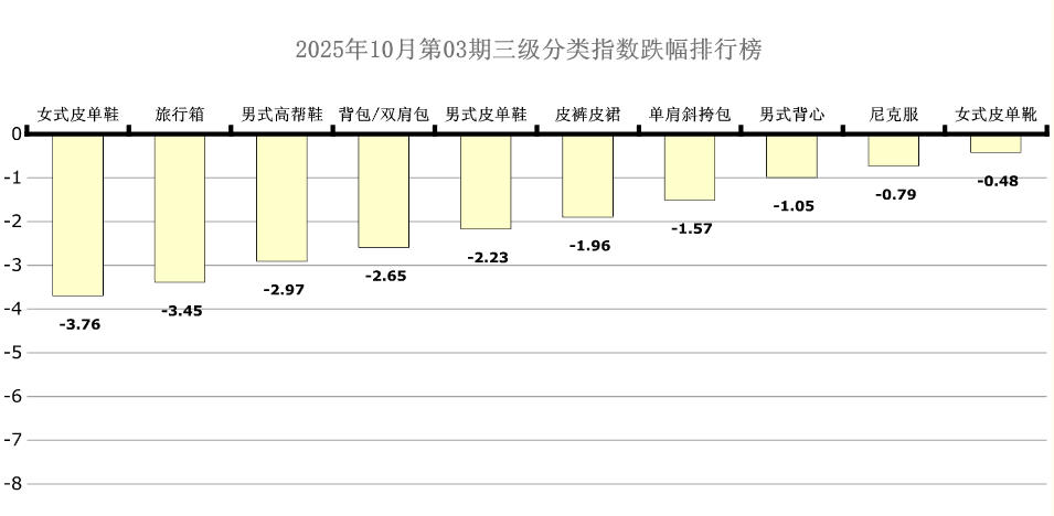 6大分类三级分类中女式皮单鞋、旅行箱、男式高帮鞋、背包/双肩包、男式皮单鞋、皮裤皮裙、单肩斜挎包、男式背心、尼克服、女式皮单靴处于跌幅榜前十列,环比跌幅分别为:3.76点、3.45点、2.97点、2.65点、2.23点、1.96点、1.57点、1.05点、0.79点、0.48点。本期旅行箱、背包/双肩包、皮裤皮裙、单肩斜挎包、男式背心、尼克服均呈现涨后回落态势。