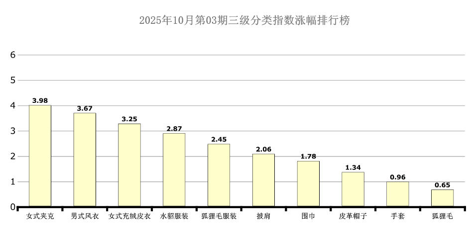 6大分类三级分类中女式夹克、男式风衣、女式充绒皮衣、水貂服装、狐狸毛服装、披肩、围巾、皮革帽子、手套、狐狸毛处于涨幅榜前十列,环比涨幅分别为:3.98点、3.67点、3.25点、2.87点、2.45点、2.06点、1.78点、1.34点、0.96点、0.65点。本期女式充绒皮衣、水貂服装、狐狸毛服装、披肩、围巾、皮革帽子、手套均呈现止跌反弹态势。