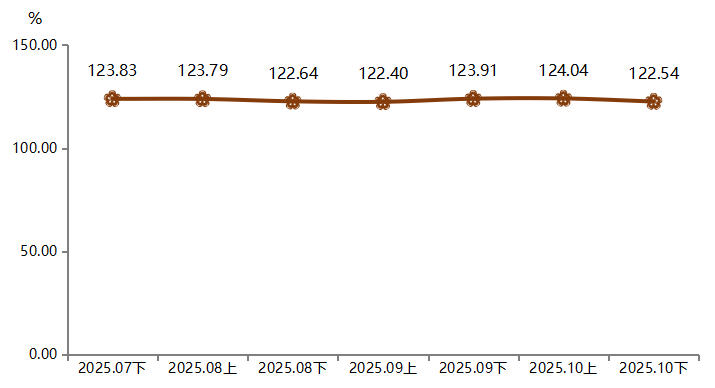 据“中国·大营裘皮产业指数”信息系统监测,2025年10月,熟皮价格指数先涨后跌。10月上半月,指数小幅上涨至124.04点;10月下半月指数回落至122.54点,较9月下半月下降1.11%。整体看,原料市场仍处于供需再平衡阶段。