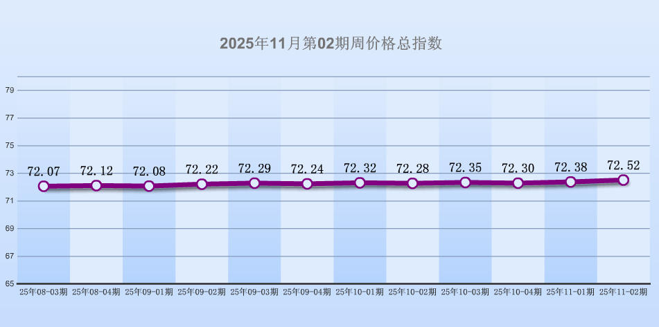 据“中国·海宁皮革指数”信息系统监测,2025年11月第02期周价格总指数报收于72.52点,环比上涨0.14点,环比涨幅0.19%,6大分类涨跌平比例是4:2:0。本周皮革城传统市场销势呈现微幅上涨,其中服装类、服饰类、鞋类、原材料类价量不等量上涨,箱包皮具类、其他类价量不等量下跌。