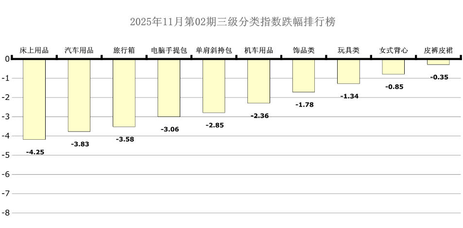 6大分类三级分类中床上用品、汽车用品、旅行箱、电脑手提包、单肩斜挎包、机车用品、饰品类、玩具类、女式背心、皮裤皮裙处于跌幅榜前十列,环比跌幅分别为:4.25点、3.83点、3.58点、3.06点、2.85点、2.36点、1.78点、1.34点、0.85点、0.35点。本期床上用品、汽车用品、机车用品、饰品类、玩具类均呈现涨后回落态势。