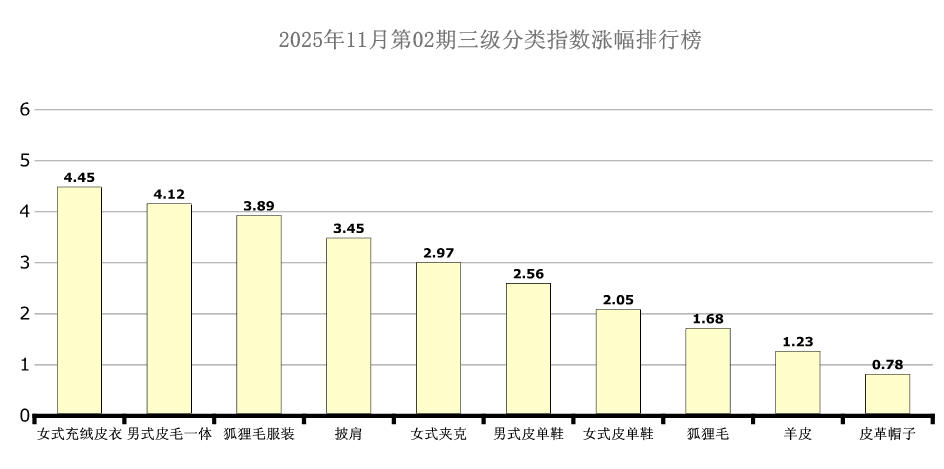 6大分类三级分类中女式充绒皮衣、男式皮毛一体、狐狸毛服装、披肩、女式夹克、男式皮单鞋、女式皮单鞋、狐狸毛、羊皮、皮革帽子处于涨幅榜前十列,环比涨幅分别为:4.45点、4.12点、3.89点、3.45点、2.97点、2.56点、2.05点、1.68点、1.23点、0.78点。本期女式充绒皮衣、男式皮毛一体、男式皮单鞋、女式皮单鞋、狐狸毛、羊皮、皮革帽子均呈现止跌反弹态势。