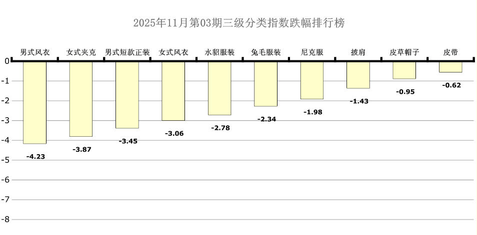 6大分类三级分类中男式风衣、女式夹克、男式短款正装、女式风衣、水貂服装、兔毛服装、尼克服、披肩、皮草帽子、皮带处于跌幅榜前十列,环比跌幅分别为:4.23点、3.87点、3.45点、3.06点、2.78点、2.34点、1.98点、1.43点、0.95点、0.62点。本期男式风衣、女式夹克、男式短款正装、女式风衣、水貂服装、兔毛服装、尼克服、披肩、皮草帽子、皮带均呈现涨后回落态势。