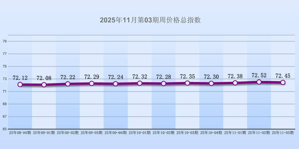 据“中国·海宁皮革指数”信息系统监测,2025年11月第03期周价格总指数报收于72.45点,环比下跌0.07点,环比跌幅0.10%,6大分类涨跌平比例是2:2:2。本周皮革城传统市场销势呈现微幅下跌,其中箱包皮具类、鞋类价量不等量上涨,服装类、服饰类价量不等量下跌,其他类、原材料类价量保持不变。