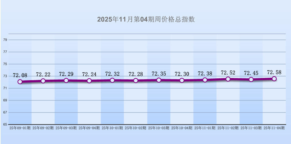 据“中国·海宁皮革指数”信息系统监测,2025年11月第04期周价格总指数报收于72.58点,环比上涨0.13点,环比涨幅0.18%,6大分类涨跌平比例是3:2:1。本周皮革城传统市场销势呈现小幅上涨,其中服装类、服饰类、其他类价量不等量上涨,箱包皮具类、鞋类价量不等量下跌,原材料类价量保持不变。