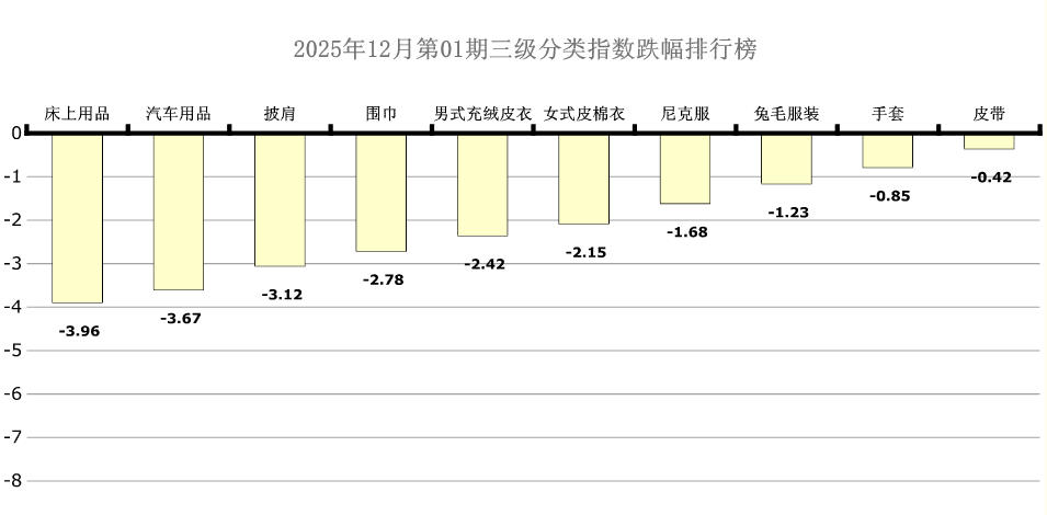 6大分类三级分类中床上用品、汽车用品、披肩、围巾、男式充绒皮衣、女式皮棉衣、尼克服、兔毛服装、手套、皮带处于跌幅榜前十列,环比跌幅分别为:3.96点、3.67点、3.12点、2.78点、2.42点、2.15点、1.68点、1.23点、0.85点、0.42点。本期披肩、围巾、男式充绒皮衣、女式皮棉衣、尼克服、兔毛服装、手套、皮带均呈现涨后回落态势。