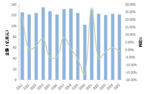 据中国海关数据显示,2025年毛纺原料与制品出口额122亿美元(折合人民币871亿元),同比微跌0.9%,基本恢复至上年同期水平。