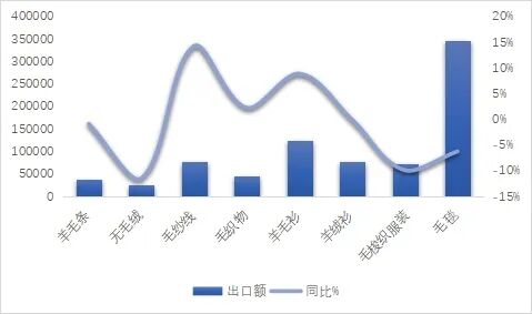 2025年主要毛纺产品出口额变化与同比情况(单价:万美元,%)