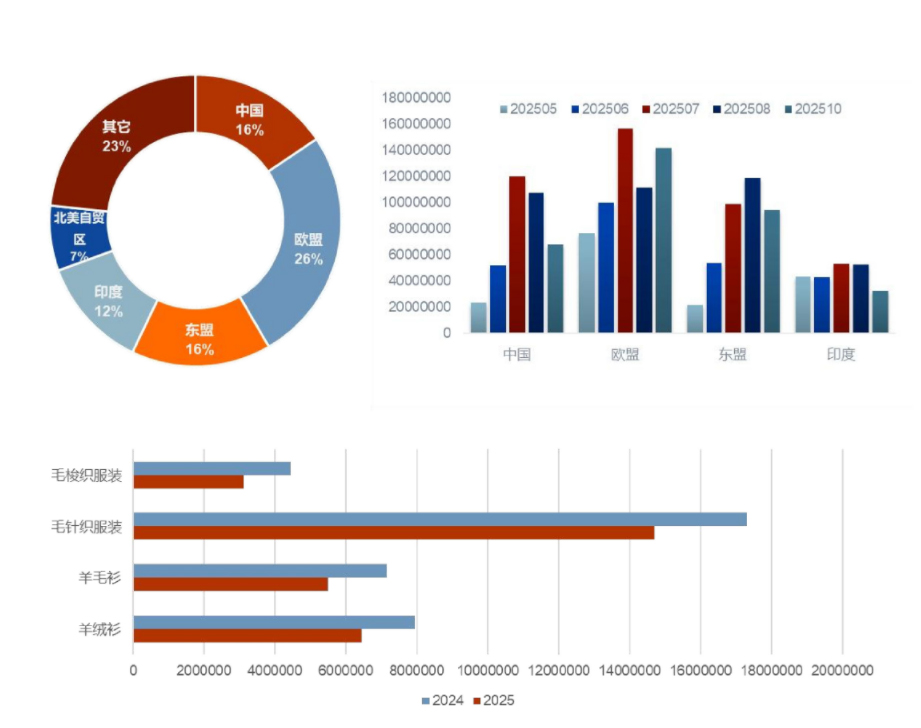 从上至下分别为:美国进口毛纺产品地区进口额份额;美国2025年5-10月月进口金额情况;2024-2025年1-11月出口美国主要毛纺服装产品出口量情况(单位:件)