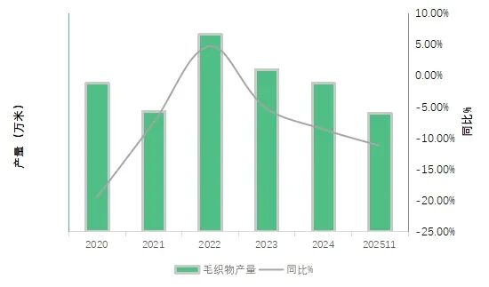 2025年,毛纺行业生产结构继续分化,主要产品产量随市场需求调整呈现差异化变化,产品结构在创新驱动下加速向高端化、功能化、绿色化升级。从产量变化来看,毛纱线与毛织物作为主要产品,2025年,毛纱线产量同比增长0.2%,毛织物同比下跌10.7%,跌幅较上半年收窄8.9个百分点。今年以来,毛纺行业的生产随着国际贸易氛围的波动而波动在内外市场的双重压力下,企业积极应对,寻求触底恢复。