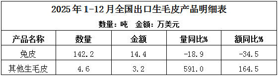 2025年1-12月,全国进口生毛皮产品430.1吨,进口额783.6万美元,同比分别下降90.9%和81.1%;产品进口单价18.2美元/千克,同比增长108.7%。