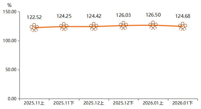 大衣作为终端消费品,其价格变动受成本、品牌溢价、库存和消费者意愿等多重因素影响,变动通常滞后且较原料市场平缓。1月大衣价格指数持续下降,从137.36点缓慢滑落至136.72点。一方面,反映了成衣厂商面对前期原材料成本上涨的压力,并未立即、全面地转嫁给消费者,而是通过内部消化、调整产品结构等方式应对;另一方面,也说明在当前的零售环境下,终端提价空间有限,消费者对价格敏感。