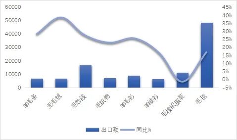 1-2月,毛纺原料与制品出口额17.7亿美元(人民币金额124.8亿元),同比增速达18.9%。除毛梭织服装外,主要毛纺产品品类出口均呈现明显的增长,但也多呈现量增价跌。其中,羊毛条出口8375吨,同比增长43.8%,出口额7051万美元,同比增长28.5%;毛纱线出口7230吨,同比增长38.0%,累计出口额1.7亿美元,同比增长27.6%;羊毛衫出口561万件,同比增长29.5%,出口额9236万美元,同比增长25.8%。毛梭织服装出口量则呈现较快下滑,1-2月出口量248万件,同比下滑33.0%,出口额1.1亿美元,同比跌幅仅1.2%。