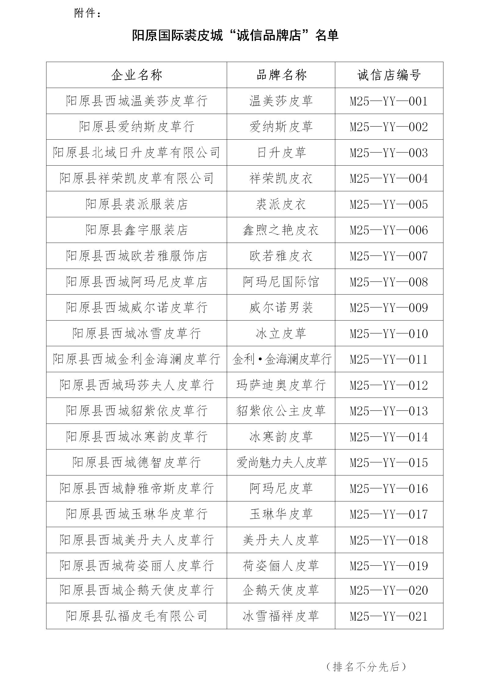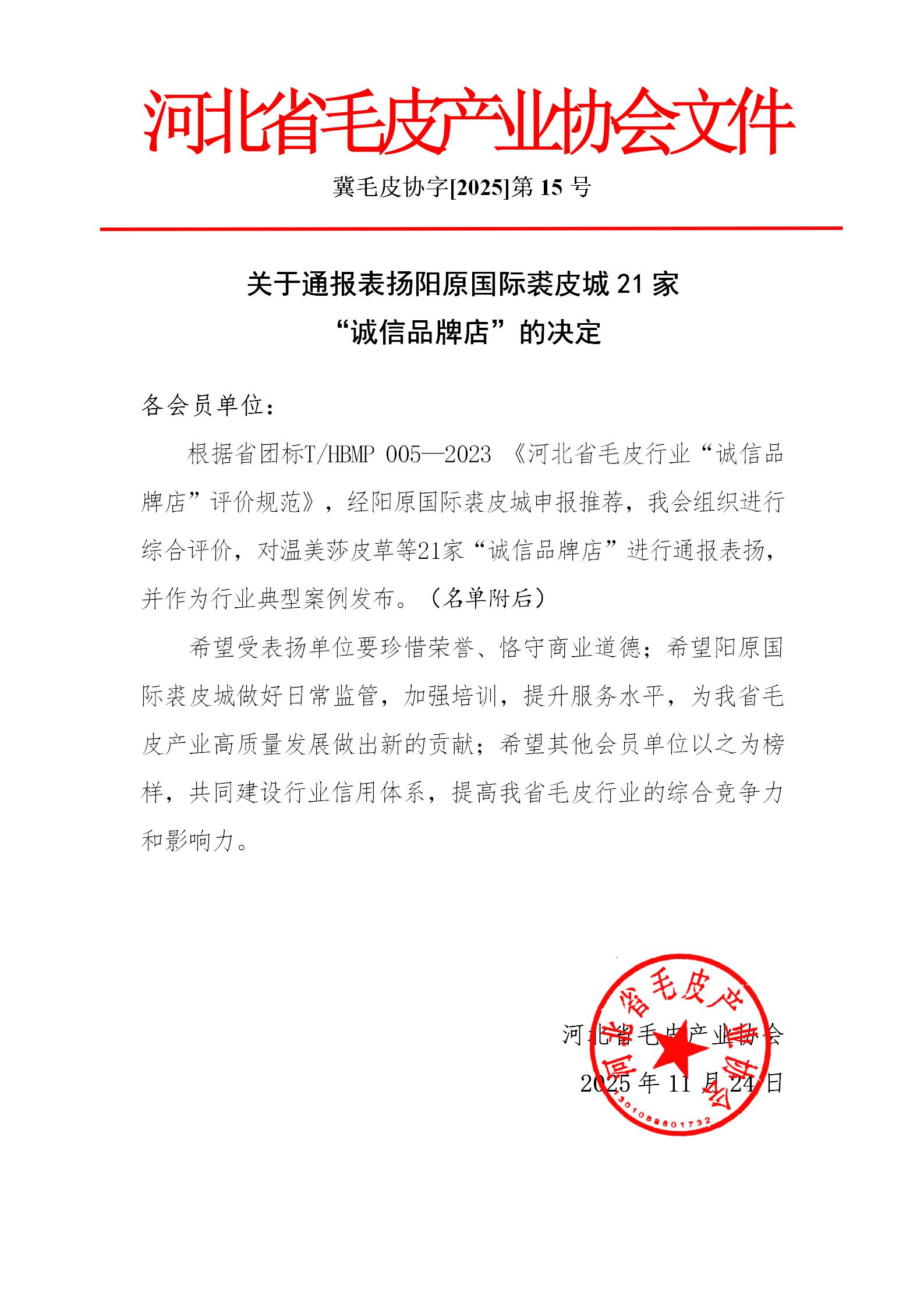 关于通报表扬阳原国际裘皮城21家 “诚信品牌店”的决定