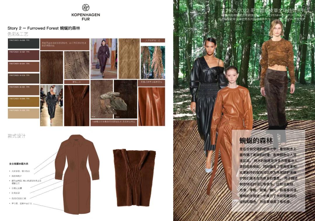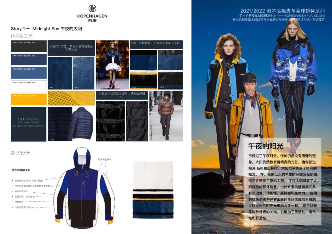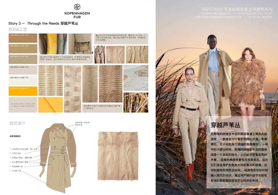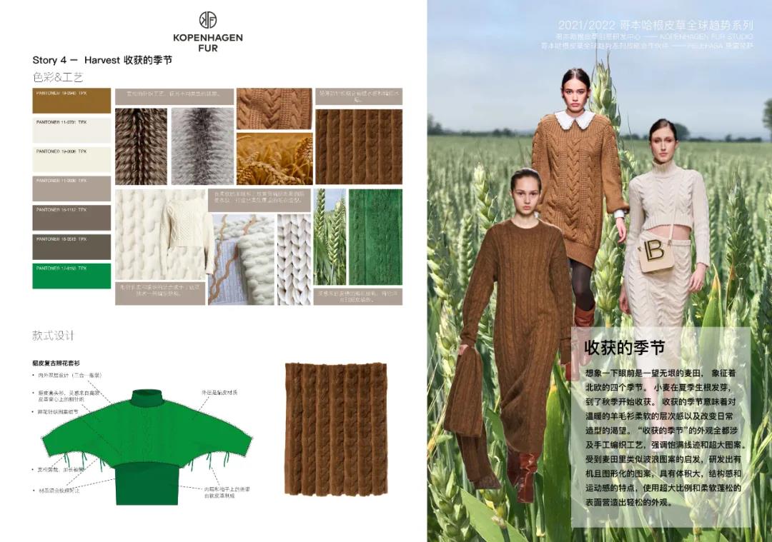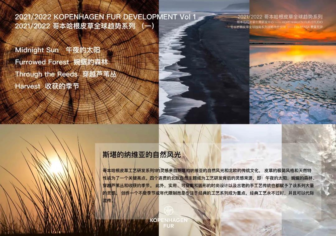此次2021/22哥本哈根皮草全球趋势系列以斯堪的纳维亚的自然风光为主题展开,从北欧的自然风光获取设计灵感,主题包含午夜的太阳、蜿蜒的森林、穿越芦苇丛、收获的季节四个部分。午夜的太阳:突出色彩的对比、远山的冷蓝碰撞火热的暖黄,以剪绒和冲孔工艺为核心,突出皮草的轻薄和透气性,塑造适宜户外运动的皮草风格。蜿蜒的森林:以深棕、焦糖色为主色,工艺技术上以错位拼接、定位折叠等手法获得不同的面料肌理。穿越芦苇丛则以轻柔的沙滩为灵感,经典的大地色系搭配经典的风衣款式,独特的皮草背胶复合、逆转缝合工艺实现了皮草的双面功能,让皮草风衣更轻薄,更实用。收获的季节:以麦穗的造型为灵感,以皮草工艺呈现针织复古绞花的纹理,柔和的本白色系搭配草绿色系,清新自然。