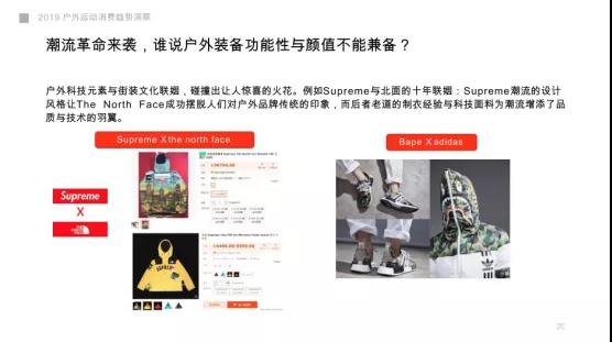 与男性注重功能性不同,女性在挑选装备时会考虑款式、色彩。各大品牌在户外产品的设计、款式和科技含量上已经不再只考量产品的单一功能性,还融入了更多时尚元素。《2019户外运动消费趋势洞察》显示,户外运动品牌与潮流服饰联姻成为近年来户外运动发展的一大特征。