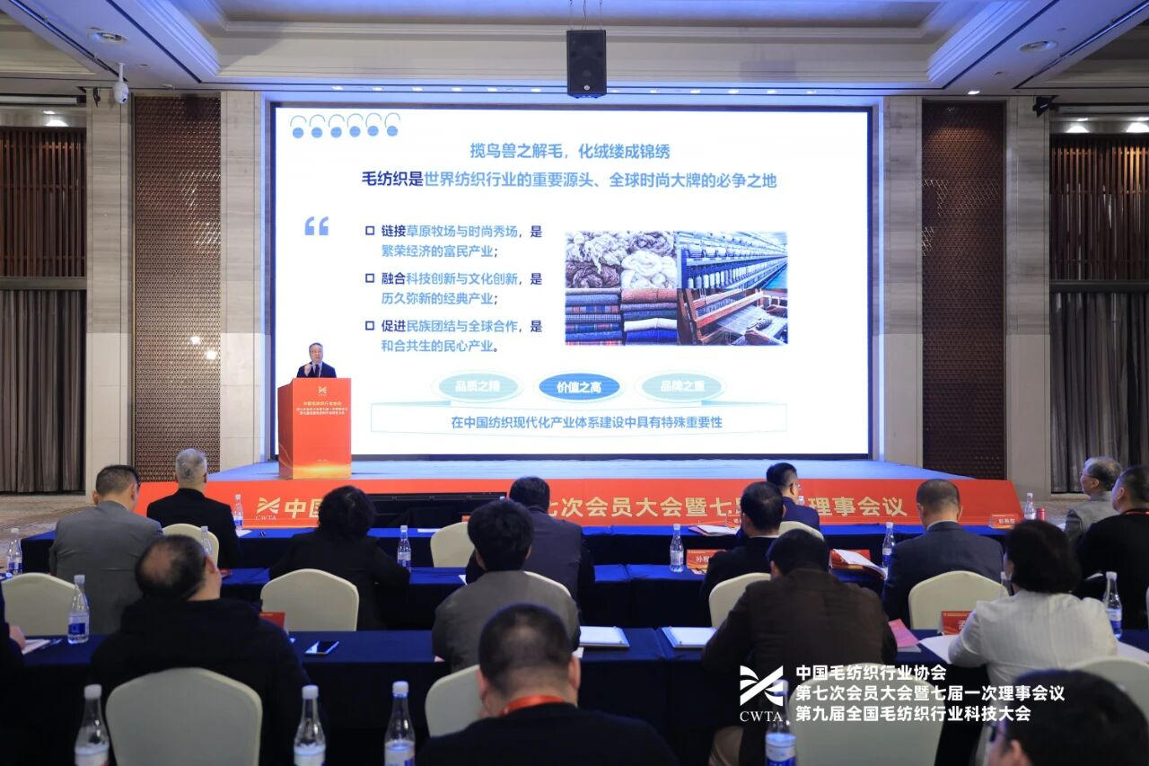 刘家强代表第七届理事会发表讲话。他表示,新一届理事会恰逢国家“十四五”规划收官与“十五五”规划谋篇布局的历史交汇点,是毛纺行业迈向高质量发展的关键五年。未来五年,中毛协将聚焦以下六大核心工作方向发力:强化战略引领,深度融入国家发展新格局;突出创新核心,塑造科技自立自强新优势;践行绿色承诺,开创可持续转型新路径;加快数智融合,赋能产业效率与模式新变革;深耕高品质绒毛纤维价值提升,培育品牌与市场新动能;深化开放协同,构建内外联动发展新生态。