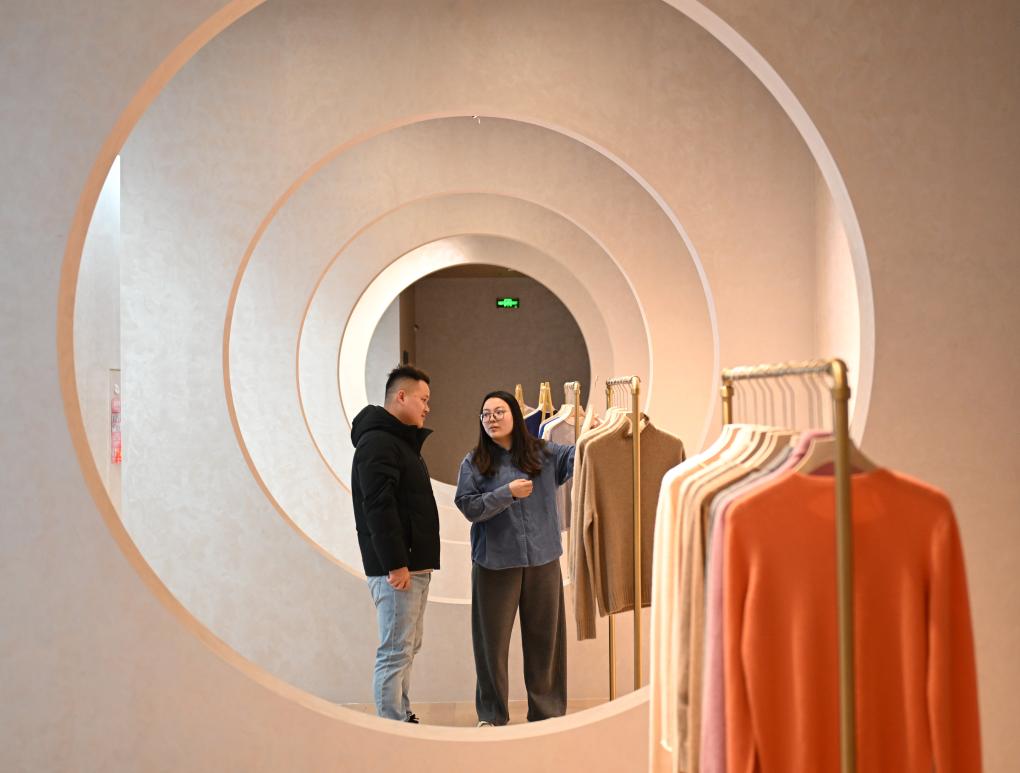 2025年1月18日,河北省邢台市清河县一家羊绒制品生产企业的员工在展厅内为客户介绍产品。新华社记者牟宇摄