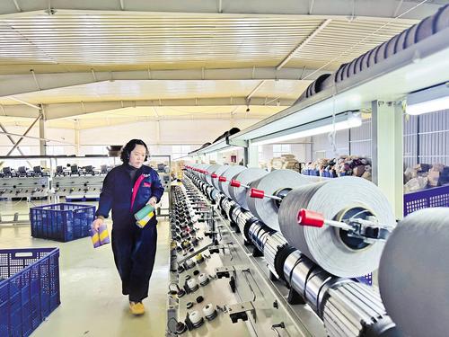 3月12日,清河县兴利智能针织共享工厂生产车间,工人在处理纱线。河北日报记者 常方圆摄