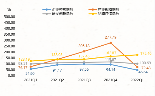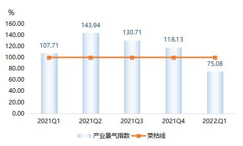 2022年一季度,产业景气指数近一年首次跌破荣枯线,收报75.08点,环比下行43.05个百分点。从产业景气指数分项指标指数来看,2022年一季度,产业景气指数分项指标指数双双下滑,指数具体运行情况如图六所示。