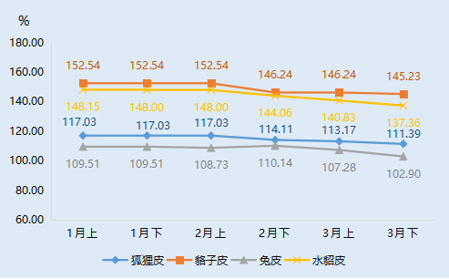 2022年一季度,狐狸皮产品价格指数2月上半月前保持稳定运行态势,2月下半月由于需求减少均出现下滑,收报114.11点,而后狐狸皮产品价格指数继续呈现下滑运行态势,3月下半月收报111.39点,相比1月上半月下滑4.82%,貉子皮产品价格指数2月上半月前同样运行稳定,2月下半月下滑至146.24点,而后貉子皮产品产品价格指数跌后短期企稳,3月下半月再次小幅下滑收报145.23点,相比年初下滑4.79%。水貂皮产品价格指数一季度前期运行较为稳定,后期持续下滑,3月下半月收报137.36点,相比年初下滑7.28%。兔皮产品由于下游产品应用较为广泛,一季度兔皮产品价格指数波动运行,其指数2月下半月小幅下滑收报108.73点,而后短期回升至110.14点,为一季度最高点,3月持续下滑,最终收报102.90点,相比年初累计下跌6.04%。