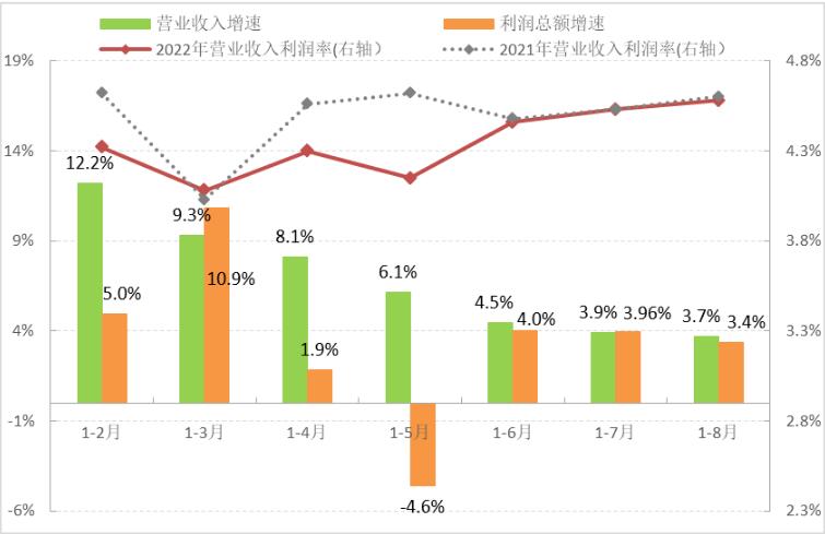 今年以来,受疫情扰动、订单不足、成本高企等多重因素影响,我国服装行业主要效益指标增速持续放缓,经济运行严重承压。根据国家统计局数据,1-8月,我国服装行业规模以上(年主营业务收入2000万元及以上)企业13117家,实现营业收入9504.01亿元,同比增长3.71%,增速比1-7月放缓0.2个百分点,比2021年同期放缓5.87个百分点;利润总额435.7亿元,同比增长3.37%,增速比1-7月放缓0.59个百分点,比2021年同期放缓6.16个百分点。行业运行效率下降,成本居高不下导致企业盈利难以提升。1-8月,服装行业规模以上企业产成品周转率为11.91次/年,同比下降3.34%;营业成本同比增长4.43%,高于营业收入增速0.72个百分点,每百元营业收入含成本86.08元,比2021年同期增加0.59元;营业收入利润率为4.58%,比2021年同期下降0.02个百分点。