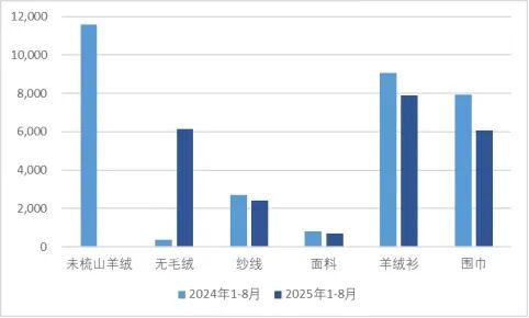 2025年1-8月,山羊绒原料及制品进出口总额为12.62亿美元,同比下降5.07%,整体延续“出口微增、进口下降”的态势,出口品类单价持续优化;进口受市场需求变化影响,整体规模进一步缩减。