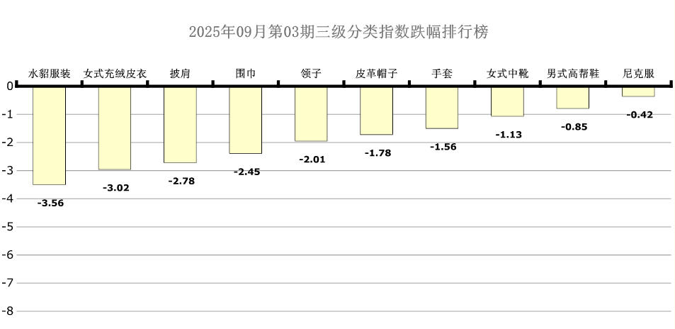 6大分类三级分类中水貂服装、女式充绒皮衣、披肩、围巾、领子、皮革帽子、手套、女式中靴、男式高帮鞋、尼克服处于跌幅榜前十列,环比跌幅分别为:3.56点、3.02点、2.78点、2.45点、2.01点、1.78点、1.56点、1.13点、0.85点、0.42点。本期披肩、围巾、领子、皮革帽子、手套、尼克服均呈现涨后回落态势。