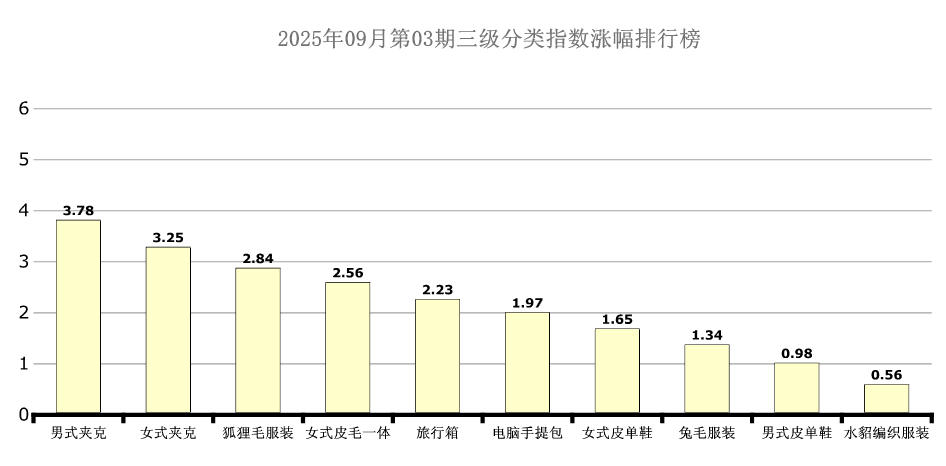 6大分类三级分类中男式夹克、女式夹克、狐狸毛服装、女式皮毛一体、旅行箱、电脑手提包、女式皮单鞋、兔毛服装、男式皮单鞋、水貂编织服装处于涨幅榜前十列,环比涨幅分别为:3.78点、3.25点、2.84点、2.56点、2.23点、1.97点、1.65点、1.34点、0.98点、0.56点。本期女式皮毛一体、旅行箱、电脑手提包、女式皮单鞋、男式皮单鞋均呈现止跌反弹态势。