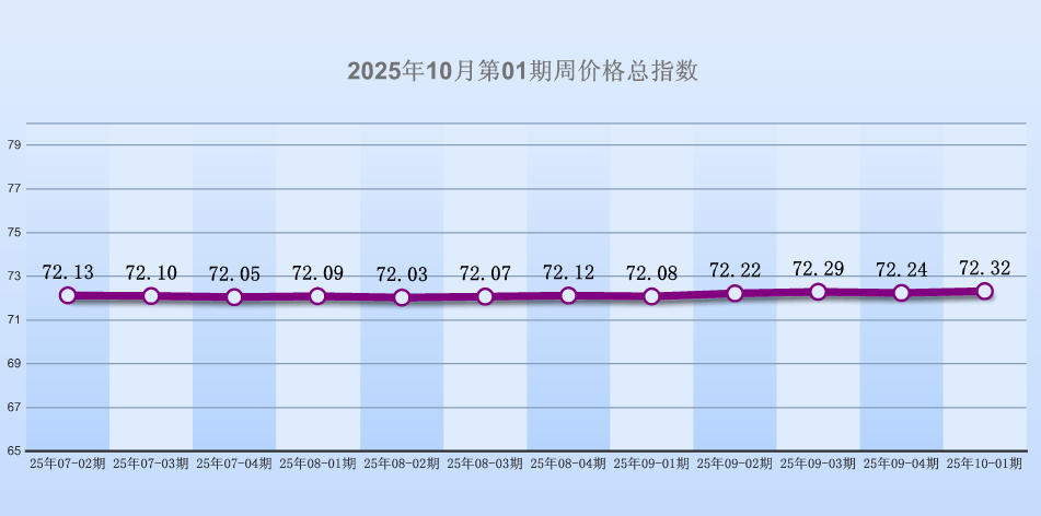据“中国·海宁皮革指数”信息系统监测,2025年10月第01期周价格总指数报收于72.32点,环比上涨0.08点,环比涨幅0.11%,6大分类涨跌平比例是3:2:1。本周皮革城传统市场销势呈现微幅上涨,其中服装类、服饰类、鞋类价量不等量上涨,箱包皮具类、其他类价量不等量下跌,原材料类价量保持不变。