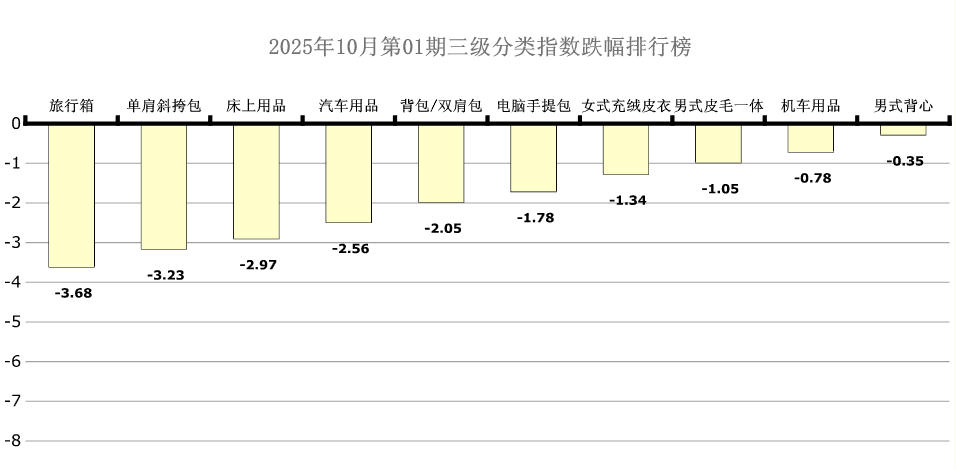 6大分类三级分类中旅行箱、单肩斜挎包、床上用品、汽车用品、背包/双肩包、电脑手提包、女式充绒皮衣、男式皮毛一体、机车用品、男式背心处于跌幅榜前十列,环比跌幅分别为:3.68点、3.23点、2.97点、2.56点、2.05点、1.78点、1.34点、1.05点、0.78点、0.35点。本期旅行箱、单肩斜挎包、床上用品、汽车用品、背包/双肩包、电脑手提包、男式背心均呈现涨后回落态势。
