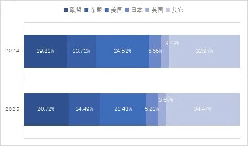 2024-2025年1~9月毛纺原料及制品主要出口目的地出口额占比变化情况(单位:%)
