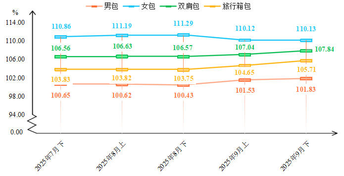 9月下半月,四类细分产品价格指数全面回升。其中,旅行箱包和双肩包成为增长主力,价格指数分别收于105.71点和107.84点,环比分别上涨1.01%和0.75%;男包价格指数涨势次之,收于101.83点,环比上涨0.30%;女包价格指数基本平稳运行,收于110.13点,较上期高出0.01个百分点。