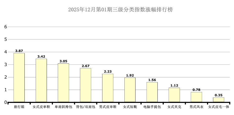 6大分类三级分类中旅行箱、女式皮单鞋、单肩斜挎包、背包/双肩包、男式皮单鞋、女式短靴、电脑手提包、女式夹克、男式风衣、女式皮毛一体处于涨幅榜前十列,环比涨幅分别为:3.87点、3.42点、3.05点、2.67点、2.23点、1.92点、1.56点、1.12点、0.78点、0.35点。本期旅行箱、女式皮单鞋、单肩斜挎包、背包/双肩包、男式皮单鞋、女式短靴、电脑手提包、女式夹克、男式风衣均呈现止跌反弹态势。