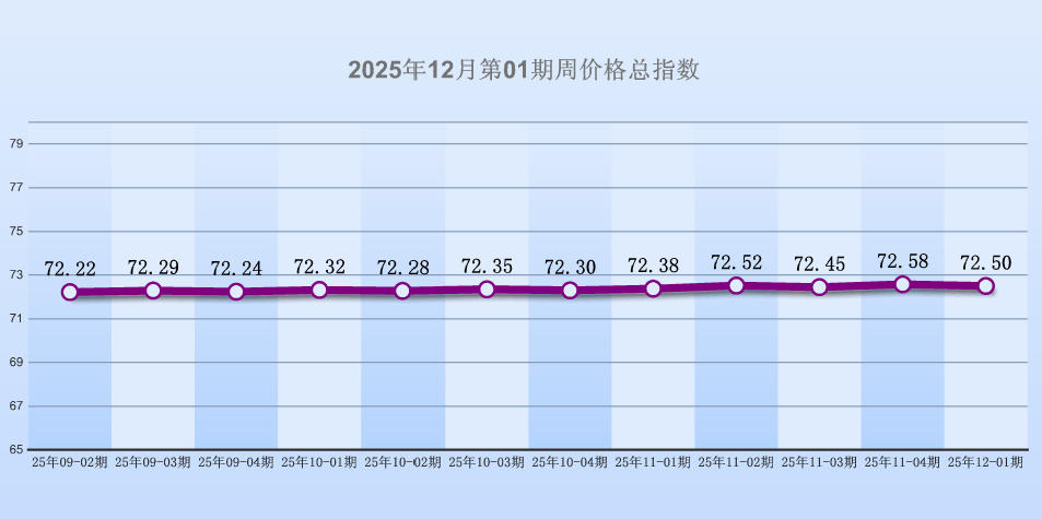 据“中国·海宁皮革指数”信息系统监测,2025年112月第01期周价格总指数报收于72.50点,环比下跌0.08点,环比跌幅0.11%,6大分类涨跌平比例是3:2:1。本周皮革城传统市场销势呈现微幅下跌,其中箱包皮具类、鞋类价量不等量上涨,服装类、服饰类、其他类价量不等量下跌,原材料类价量保持不变。